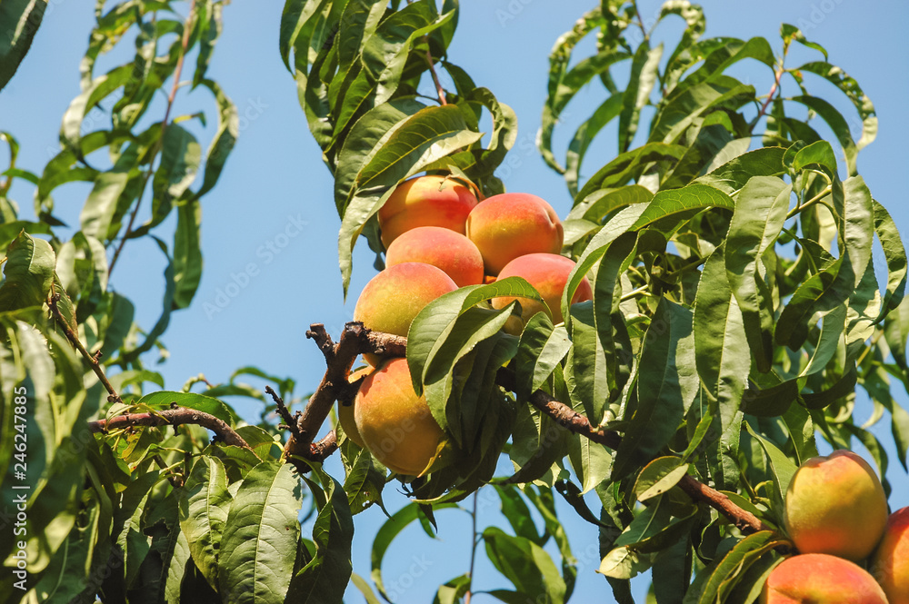 Ripe Peach On Tree Peaches On The Tree Close Up Fresh Fruit Health Benefits Concept Ripe Peaches In Green Leaves On A Tree Stock Photo Adobe Stock